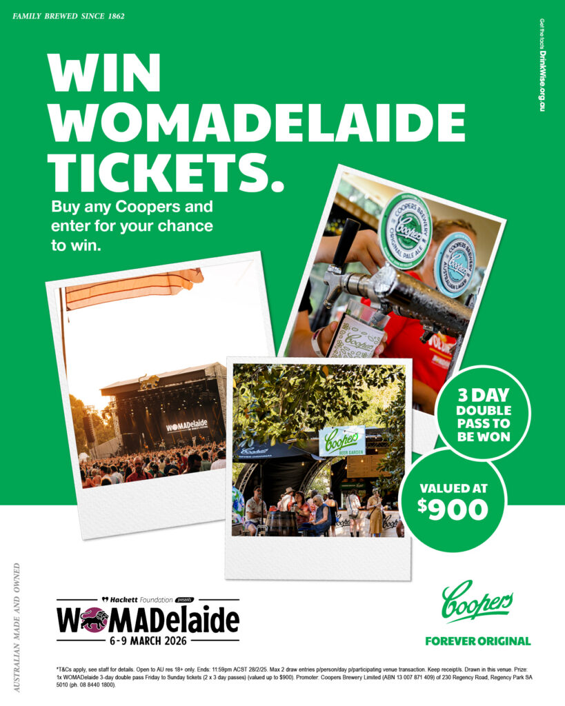*T&Cs apply. Open to AU res 18+ only. Ends: 11:59pm ACST 28/2/25. Max 2 draw entries p/person/day p/participating venue transaction. Keep receipt/s.